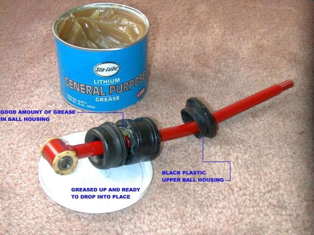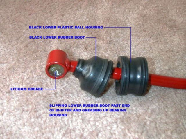 Once this is done, pull the shifter out of the interior cup assembly. Grease the pivot ball of the new shifter with white lithium grease (a small amount is included, if not please make sure to use white lithium ONLY!) and re-insert into the cup assembly. See below for pics of member Lino Sacman's shifter.