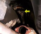 The next thing to do is secure and raise the vehicle. Next, loosen a couple of screws so that the shielding can be moved a bit. This is done to allow easier access to the bottom part of the shifter and the shift linkage. Remove the bolt that attaches the shifter to the shift linkage (right photo above). Remove the bearing from the shifter and save for later re-use.